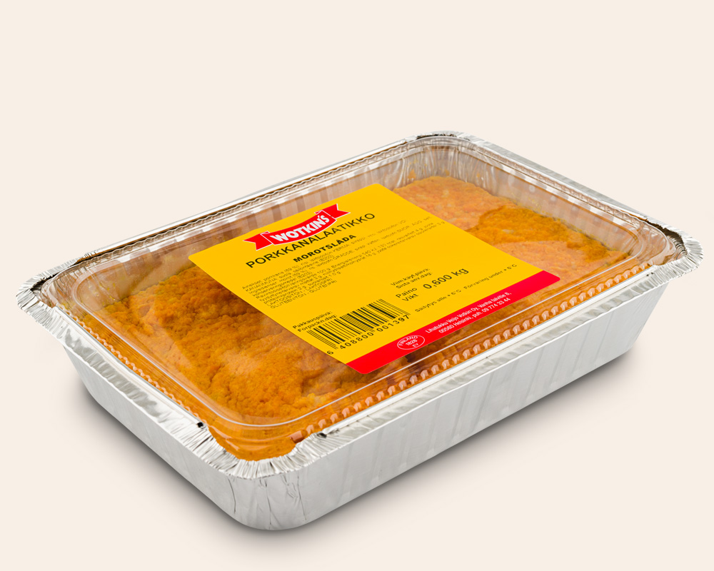 Porkkana (69 %), riisi, laktoositon KERMA, siirappi, vesi, laktoositon VOI, KANANMUNA, suola (1,0 %), säilöntäaine (E202).
